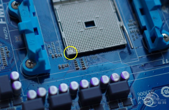 在安装Intel CPU的时候,首先要留意CPU插槽扣具上的三角形,安装CPU时,CPU的金色小三角要跟这个扣具上的三角形同指向,这样装下去就万事大吉。